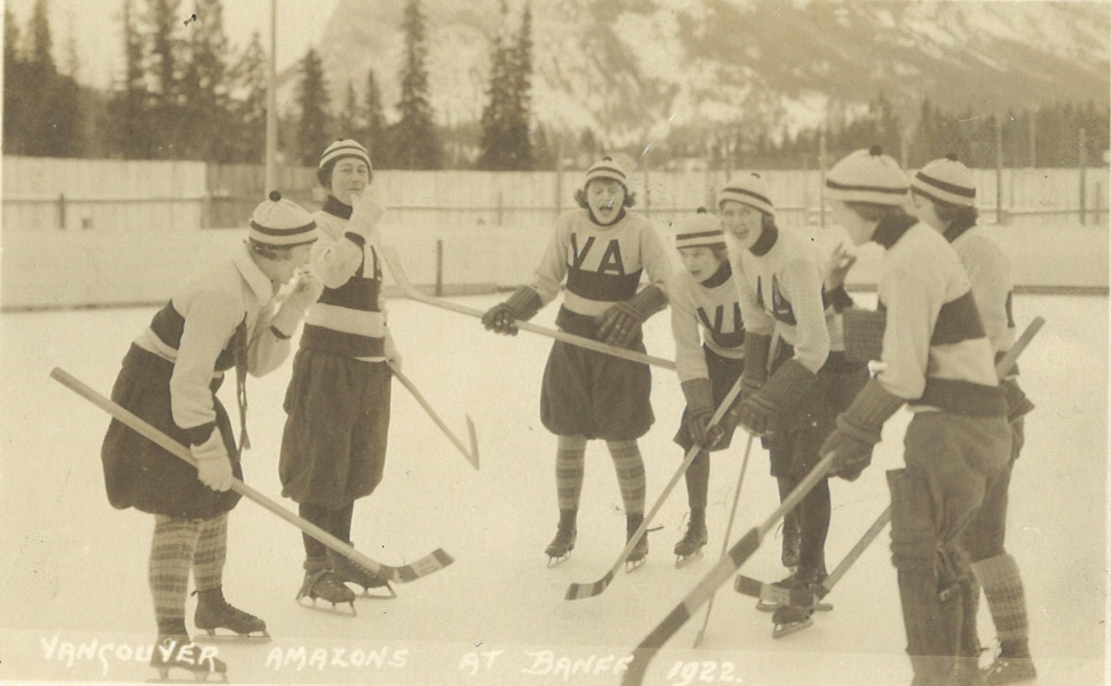 In the early 1920s, one of the best-known women’s hockey tournaments anywhere in Canada took place each year in southwestern Alberta at the Banff Winter Carnival. In February 1921, for the first time the Amazons made the decision to travel the 30 hours by train to Banff and play for the Alpine Cup, emblematic of western Canadian women’s hockey supremacy. The Amazons marked their debut in Banff sporting distinctive new uniforms that became their trademark thereafter: white sweaters with red trim featuring bright red letters “VA” on the front, as well as matching toques, black bloomers, and striped socks. Previously the team had worn mismatched maroon and white sweaters discarded by the Vancouver Millionaires men’s players.