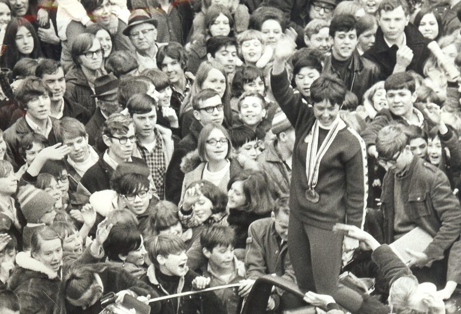 With a short break in the World Cup schedule, Nancy returned home and was celebrated unlike any athlete prior to that time in BC’s history. On March 7th, a massive parade was held in Vancouver, from the downtown core to the North Shore, with an estimated 100,000 people turning out to witness Nancy’s triumphant return. The street lines were painted “Greene” for the occasion and the Vancouver Sun was printed on “Greene” newspaper, while parade goers wore every shade of ‘Greene’ possible from their closets.