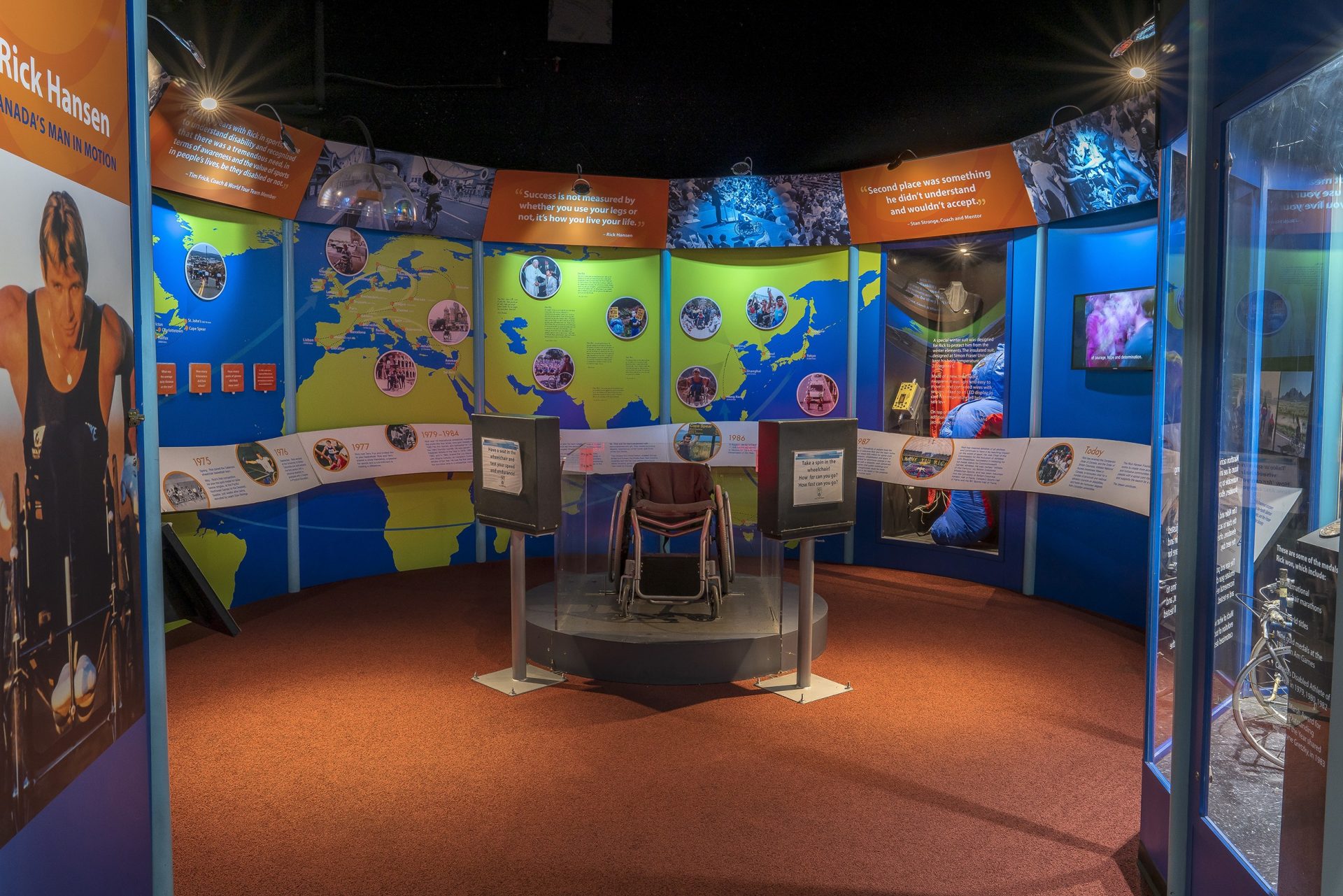 The gallery features Rick’s Man in Motion wheelchair, competitive wheelchair marathon medals, world tour memorabilia and video footage. Known to the world as the Man in Motion, Rick Hansen literally wheeled around the world in his wheelchair. Over a period of two years, he visited 34 countries and amassed a staggering 25,000 miles in his quest to raise awareness for people with disabilities and money for spinal cord research.